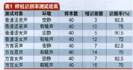 本系統(tǒng)的樣機(jī)實(shí)驗(yàn)主要是測(cè)試非特定人的語(yǔ)音識(shí)別率和模擬開(kāi)關(guān)動(dòng)作的準(zhǔn)確率。由于汽車(chē)音響的語(yǔ)音詞條為2~4個(gè)字,語(yǔ)音識(shí)別率實(shí)驗(yàn)內(nèi)容為車(chē)載音響常用2字詞條指令18條、3字詞條指令12條、4字詞條指令10條,實(shí)驗(yàn)對(duì)象為6人4男、2女(普通話(huà)和方言),實(shí)驗(yàn)環(huán)境為噪聲干擾環(huán)境和相對(duì)安靜環(huán)境,樣機(jī)測(cè)試結(jié)果如表1所示?! ?/p>