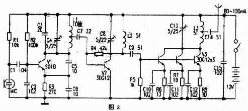 圖2為2km調(diào)頻發(fā)射機電路。本電路分為振蕩、倍頻、功率放大三級。電路中V1、C2--C6、R2、R3及L1組成電容三點式振蕩器,其振蕩頻率主要由C3、C4和L1的參數(shù)決定,其振蕩頻率為44~54MHz,該信號從L1的中心抽頭處輸出,再經(jīng)過C7耦合至V2放大,由C8和L2選出44~54MHz的二倍頻信號,即88-108MHz,,此信號由C9耦合至V3進行功率放大,V3由3只3DGl2三極管并聯(lián)組成,可擴大輸出功率。該電路正常工作時,電流約80-100mA。組成V3的三只3DG12可加上適當?shù)纳崞?,以防過熱。制作時L1~L3用0.31mm漆包線在直徑3.5mm圓棒上單層平繞。