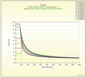 像上圖一樣的繪出一個電機(jī)的轉(zhuǎn)矩——轉(zhuǎn)速曲線并非輕而易舉之事,需要每個轉(zhuǎn)速下優(yōu)化超前角來得到。MotorSolve可以快速設(shè)置多種轉(zhuǎn)速和超前角的組合方式,來繪制上述圖形。通過這些曲線的包絡(luò)線,能得到轉(zhuǎn)矩——轉(zhuǎn)速曲線和優(yōu)化的超前角。恒功率變速內(nèi)嵌磁鋼式永磁電機(jī)的曲線如上圖所示。