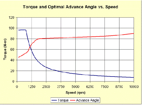 這幅圖中可以提取每個轉(zhuǎn)速下優(yōu)化超前角的峰值轉(zhuǎn)矩。當(dāng)電機(jī)超過恒轉(zhuǎn)矩區(qū)域(大概875轉(zhuǎn)/分)后,弱磁的優(yōu)勢突顯出來。