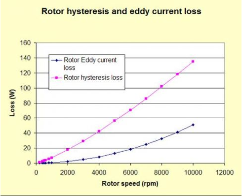 銅損是電機(jī)整體損耗中關(guān)鍵的部分,MotorSolve先進(jìn)的損耗計算能力能計算出基于元件級的磁滯和渦流損耗。上圖表明轉(zhuǎn)子的磁滯和渦流損耗是轉(zhuǎn)速的函數(shù)(或等價的是頻率的函數(shù))。渦流趨勢呈現(xiàn)拋物線型,而磁滯損耗與功率曲線規(guī)律相似。