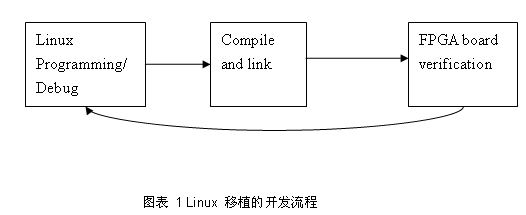 使用者開始進行Linux移植到晶心平臺,首先須先選定一版晶心的Linux原始碼作為基準再進行軟件移植,修改原始碼以符合使用者的開發(fā)平臺,經由工具鏈的compile與link所產生的Linux的映像文件,再放到FPGA板上以驗證程序編寫的正確與否,依此開發(fā)程序:軟件編寫->FPGA板驗證,再回到軟件編寫程序直到所有周邊IP在FPGA板上驗證完全,Linux 移植才完成,如圖表 1所示,Linux移植過程中,AICE調試可以有效加快Linux移植的速度。