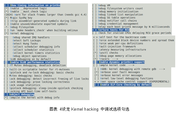 Linux Kernel 需要設定一些調試選項,才能順利的運用AndeSoft™的GDB進行調試。晶心平臺中Linux kernel 調試選項設定如圖表4所示,增加這些選項會增加kernel 映像文件的空間,如果空間占用過大以至于不符合設計需求時,可在調試工作完畢后將調試選項關閉以節(jié)約不必要的空間浪費。