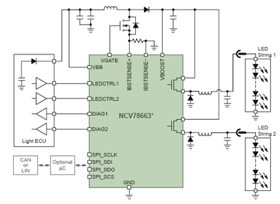 安森美半導(dǎo)體的NCV78663單芯片、智能前照燈LED驅(qū)動器可實現(xiàn)遠光燈、近光燈、日間行車燈、示廓燈、彎道輔助照明燈、轉(zhuǎn)向指示燈、及霧燈的單芯片控制。NCV78663集成了數(shù)字調(diào)光、SPI可編程設(shè)置和內(nèi)置診斷,提供了一個集成的、高能效集成型前照燈控制解決方案。
