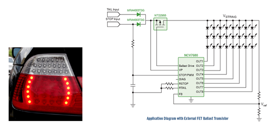 NCV7680可以作為一個獨立器件,也可以作為配合復(fù)雜系統(tǒng)的額外支持電路。結(jié)合升壓控制器運行時,額外LED可連接為一個LED串。其典型應(yīng)用包括組合尾燈、日間行車燈(DRL)、霧燈、中央高位剎車燈(CHMSL)陣列、轉(zhuǎn)向指示燈和其他外部調(diào)制應(yīng)用、液晶顯示器(LCD)背光等。