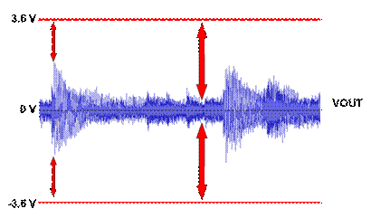 在 AB 類放大器的接地置中架構(gòu)做法中,放大器總是以最高電源電壓運(yùn)作,這表示,對(duì)于音頻的無噪聲階段而言,整個(gè)輸出 FET 的電壓降幅相當(dāng)大。以鋰離子電池為例,一般的電池電壓范圍是 3.0V 至 4.2V。假設(shè)電池供應(yīng) 3.6V 的電壓,圖 5 的紅色箭頭表示播放輸出音頻時(shí)整個(gè)輸出 FET 的電壓降幅。