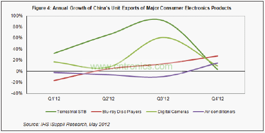 據(jù)IHS iSuppli公司的中國研究服務(wù),2012年第一季度中國主要消費電子產(chǎn)品的出口高于預(yù)期,主要是因為銷售渠道中的庫存較低,需要購買更多產(chǎn)品以補充庫存。