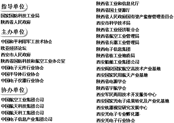 中國國際軍民結合技術產(chǎn)業(yè)博覽會(原中國國際和平利用軍工技術與裝備(西安)博覽會、中國西部國際電子工業(yè)博覽會、中國西部國際國防電子博覽會)(簡稱軍博會),是由國家國防科學技術工業(yè)局、陜西省人民政府指導,由中國和平利用軍工技術協(xié)會、陜西省國防科技和航空工業(yè)辦公室、中國電子元件行業(yè)協(xié)會共同主辦,由西安閻良國家航空高技術產(chǎn)業(yè)基地、西安國家民用航天產(chǎn)業(yè)基地、西北工業(yè)技術研究院等單位組織,由中國航空工業(yè)集團公司等十一大軍工集團、以及各省區(qū)市國防科工辦共同協(xié)辦,西安曲江三聯(lián)會展有限公司策劃承辦的,每年秋季在古城西安舉行的一次具有專業(yè)化、規(guī)?;?、國際化的大型軍民兩用技術與裝備暨電子工業(yè)展示洽談會。