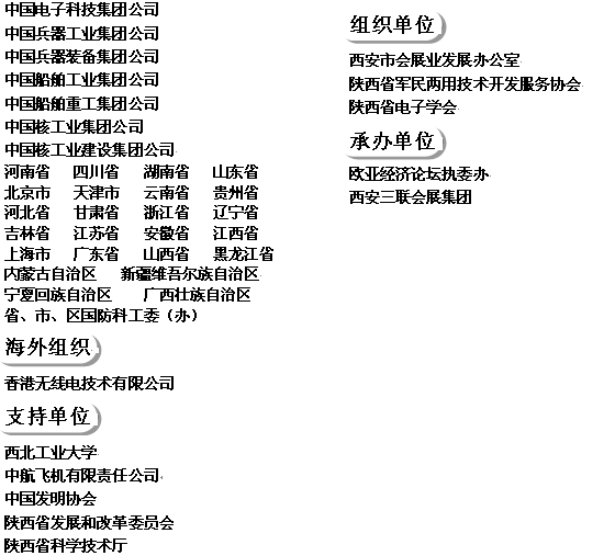 中航一集團621所、中航二集團直升機部、航天二院23所、仿真中心、706所、航天三院總體部、31所、33所、35所、8357所、8511所、蘭州軍區(qū)、總后駐西安軍代局、總裝駐西安軍代局、海軍駐西安軍代局、空軍駐西安軍代局、酒泉衛(wèi)星發(fā)射中心、華陰常規(guī)兵器試驗基地、第26試驗訓練基地(63750部隊)、第32試驗訓練基地(63870部隊)、西安衛(wèi)星測量控制中心、63672部隊、68306部隊、94162部隊、61363部隊、95956部隊、68054部、68126部隊、61540部隊、聯(lián)勤第28分部、總后建筑工程研究所、總裝西安軍代局、海軍駐西安地區(qū)軍事代表局、空軍駐西安地區(qū)軍事代表局、空軍工程大學電訊工程學院、總裝備部后勤部西北辦事處、陜西陸軍預備役高炮師、空軍工程大學工程學院、第二炮兵工程學院、武警西安指揮學院、武警工程學院電子技術系、工程兵駐西安和蘭州地區(qū)軍事代表室、西安通信學院、西安陸軍學院、陜西陸軍預備役高炮師四團、總參通信二站第二通信團、海軍北海艦隊導彈驅逐艦第一支隊西安艦、中國航天科技集團、中國運載火箭技術研究院、中國空間技術研究院、航天動力技術研究院、航天推進技術研究院、上海航天技術研究院、四川航天技術研究院、中國航天時代電子公司、航天空氣動力技術研究院、成都飛機設計研究所、沈陽飛機設計研究所、中國直升機設計研究所、航天710所、洪都航空工業(yè)集團、第一飛機設計研究所、北京航天動力研究所 、兵器工程師進修大學、中國兵器工業(yè)集團、中國兵器科學研究院、總裝炮兵局、總裝輕武器論證所、兵科院單兵裝備處、兵器裝備集團公司輕武器處、兵器工業(yè)211所、航天508所、總裝備部科技委、總裝備部陸軍科訂部、中國兵器工業(yè)第203、204、205、206、210、213所;中國航天8357、771所、7171所、中國電子科技集團10所、15、20、28、29、30、32、38、39、41、54所;中國航天706所、中國航天771所、中國船舶707所、中國船舶709所、中國船舶716所、中國航空601所、中國航空611所、中國航空612所、中國航空613所、中國航空618所、中國航空631所、中國兵器210所、中國兵器508所、國營248廠、國營368廠、國營785廠、國營789廠、解放軍電子工程學院、國防科技大學、西北工業(yè)大學、哈爾濱工業(yè)大學、北京航空航天大學、空軍工程大學導彈學院、軍械工程學院、防空兵指揮學院、第二炮兵指揮學院、二炮裝備研究院、海軍裝備研究院、空軍裝備研究院、二炮四所、空軍二所、三所、六所;空軍裝備論證 研究所、海軍裝備部裝備論證中心、海軍705、701、717所;裝甲兵工程學院、中國運載火箭技術研究院………