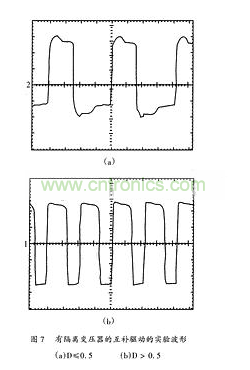 6(b)為占空比大于0.5時適用的驅動電路,其中Z2為穩(wěn)壓二極管,此時副邊繞組負電壓值較大,Z2的穩(wěn)壓值為所需的負向電壓值,超過部分電壓降在電容C2上,其實驗波形見圖7(b)。