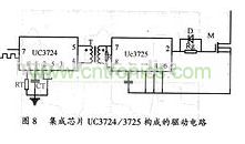 其中UC3724用來產生高頻載波信號,載波頻率由電容CT和電阻RT決定。一般載波頻率小于600kHz,4腳和6腳兩端產生高頻調制波,經高頻小磁環(huán)變壓器隔離后送到UC3725芯片7、8兩腳經UC3725進行解調后得到驅動信號,UC3725內部有一肖特基整流橋同時將7、8腳的高頻調制波整流成一直流電壓供驅動所需功率。