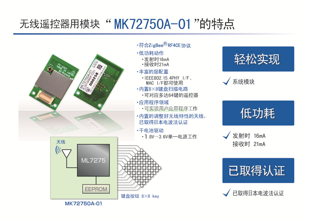 針對這種情況,LAPIS Semiconductor開發(fā)出2.4GHz無線通信模塊“MK72750A-01”,此模塊符合“ZigBee®RF4CE”協(xié)議,并且可通過內(nèi)置的調(diào)整好無線特性的天線立即發(fā)射電波。另外,此模塊作為無線通信LSI,由于內(nèi)置了本公司生產(chǎn)的“ML7275”,因此僅此模塊可以實現(xiàn)ML7275著稱的低功耗且符合RF4CE規(guī)范的無線遙控器功能。本產(chǎn)品內(nèi)置調(diào)整好無線特性的天線,已取得日本國內(nèi)電波法認證,所以,無線技術(shù)開發(fā)經(jīng)驗較少的客戶也可開始輕松開發(fā)。在日本國內(nèi),可以立即發(fā)射電波進行評價、開發(fā),因而開發(fā)周期亦可大大縮短。另外,使用了本公司設計的無線通信LSI,LSI相關(guān)事項可提供迅速、精準的技術(shù)支持。