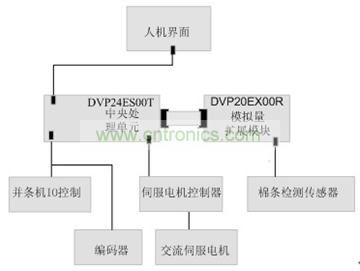 該控制系統(tǒng)的中央處理單元使用臺達(dá)DVP E系列的PLC,伺服控制系統(tǒng)使用臺達(dá)ASDA系列產(chǎn)品,人機(jī)界面使用選配DOP-B系列觸摸屏。工作時(shí),PLC通過DVP20EX00R模擬量控制模塊讀取棉條檢測傳感器的棉條厚度,對編碼器信號的處理計(jì)算出勻整1羅拉的速度,依據(jù)勻整控制關(guān)系式,就可計(jì)算出勻整2羅拉的轉(zhuǎn)速,再通過伺服控制器控制伺服電機(jī),以達(dá)到對勻整2羅拉的控制。