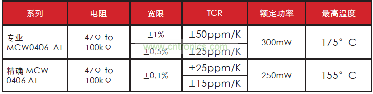 為了提高穩(wěn)定性,不論應(yīng)用場(chǎng)合是需要全功率能力還是只需要一小部分標(biāo)稱額定功耗,這些電阻都是同樣有效的。電阻有兩種型號(hào)。MCW 0406 AT 專業(yè)系列設(shè)備額定功耗高達(dá) 300mW,高溫性能達(dá)到 175°C。
