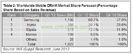 移動(dòng)市場第一季度占總體DRAM營業(yè)收入的28.0%。第一季度mDRAM平均銷售價(jià)格(ASP)為1.72美元每GB,仍然高于商品類DRAM,后者價(jià)格是0.52美元每GB。但是,由于商品類DRAM價(jià)格預(yù)計(jì)下半年上漲,而mDRAM價(jià)格總體下降,所以目前移動(dòng)DRAM所擁有的價(jià)格升水今年將逐漸縮小。與此同時(shí),2012年移動(dòng)DRAM營業(yè)收入將繼續(xù)增長,其比特出貨量預(yù)計(jì)下半年勁增20%以上。