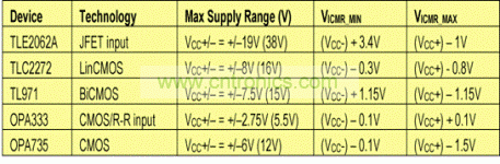 表1列舉了幾個(gè)德州儀器(TI)運(yùn)算放大器的例子及其VICMR。“最大電源范圍”欄描述了分裂式電源和單電源(括號內(nèi))限制。由該表,我們清楚地知道各運(yùn)算放大器的輸入范圍VICMR明顯不同。根據(jù)器件的具體類型,VICMR可能會低于或者超出電源軌。因此,絕不要假設(shè)運(yùn)算放大器可以接收特殊輸入信號范圍,除非在產(chǎn)品說明書規(guī)范中得到核實(shí)。