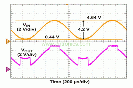 為了測試該電路,我們將VCC/2 = 5V DC偏移的300 Hz正弦波應(yīng)用于輸入端。在VOUT出現(xiàn)變化以前,一直對AC幅值進(jìn)行調(diào)節(jié)。如圖4所示,當(dāng)應(yīng)用10 Vp-p輸入時(shí),VOUT在正軌附近出現(xiàn)一個(gè)經(jīng)削波的信號,而非負(fù)軌附近。如果輸入超出VCC – 0.8V(本例中為9.2V),這種正軌附近出現(xiàn)的非理想行為是我們能夠預(yù)計(jì)到的。9.2V以下VIN電平和低至0V時(shí),VOUT顯示出正確的波形,正如我們所預(yù)期的那樣。