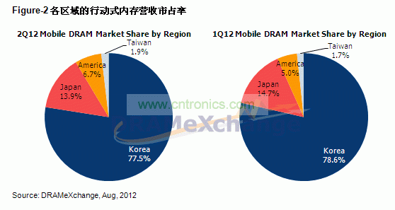 第二季行動(dòng)式內(nèi)存營(yíng)收,三星半導(dǎo)體市占逼近全球60%,仍穩(wěn)居龍頭之位,韓系廠商占全球行動(dòng)式內(nèi)存營(yíng)收的77.5%,較第一季僅小幅減少1.1%。第三名的日商爾必達(dá)市占則是小幅下滑0.8%來(lái)到13.9%,美商美光科技則受惠于中低階智能型手機(jī)的成長(zhǎng),市占小幅成長(zhǎng)至6.7%,位居第四。臺(tái)系DRAM廠亦在行動(dòng)內(nèi)存市場(chǎng)中試圖搶占一席之地,除了華邦電子之外,南科亦在本季營(yíng)收當(dāng)中初次嶄露頭角,目前比重雖然不高,但也為整個(gè)行動(dòng)式內(nèi)存的市場(chǎng)帶來(lái)不同的氛圍。值得注意的是由于下半年受到景氣不確定因素的影響,各家內(nèi)存制造商在下半年生產(chǎn)與開(kāi)發(fā)的計(jì)劃也逐漸轉(zhuǎn)趨于保守,謹(jǐn)慎應(yīng)對(duì)自2009年以來(lái)最嚴(yán)峻的景氣寒冬。