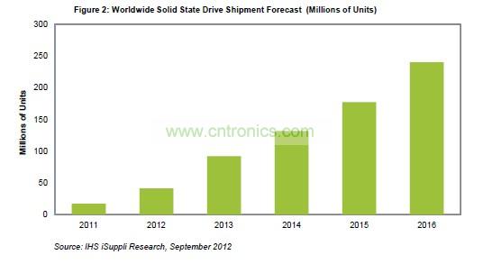 預(yù)計2013年SSD出貨量將達到9200萬個,而今年和去年分別是4100萬和1700萬個,如圖所示。明年過后仍將強勁增長,保持兩位數(shù)的速度,直到2016年,屆時預(yù)計SSD出貨量將達到2.4億個。