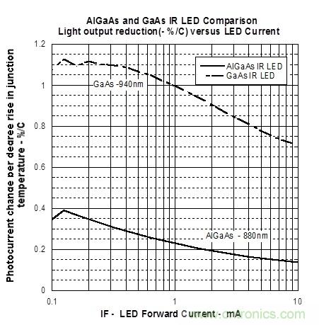 在 1mA 下工作時(shí),GaAs IR LED 光輸出減少 1%/°C。 這意味著結(jié)溫升高 50 °C 時(shí),LED 的輸出會(huì)降低 50%。 使用 AlGaAs IR LED,光輸出僅降低 0.225%/°C,因此,結(jié)溫升高 50°C 而光輸出僅降低 11%。
