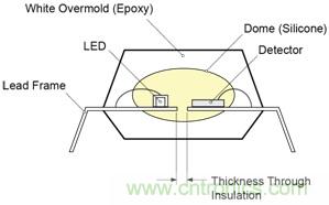 飛兆半導(dǎo)體的 FODM8801 OptoHiT 系列采用專有 OPTOPLANAR® 共面封裝技術(shù)進(jìn)行封裝,這有助于提高低電流下的性能。 圖 2 展示了 OPTOPLANAR 技術(shù)的截面圖。
