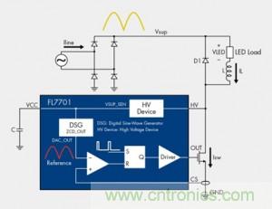 FL7701集成有功率因數(shù)校正(PFC)。可以從使用小型陶瓷維持電容的整流離線輸入來(lái)供電。這樣就可省去輸入端的電解電容,也不需要用于IC的自偏置電源軌。