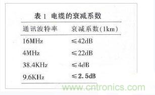 導(dǎo)線的電阻對(duì)信號(hào)的影響很小,可以忽略不計(jì)。電纜的分布電容C主要是由雙絞線的兩條平行導(dǎo)線產(chǎn)生。信號(hào)的損失主要是由于電纜的分布電容和分布電感組成的LC低通濾波器。通訊波特率越高,信號(hào)衰減也會(huì)越大。常規(guī)電纜的衰減系數(shù)見表1。