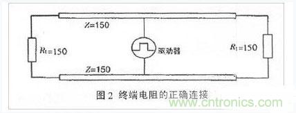 ②阻抗不連續(xù),顧名思義,與光從一種媒質(zhì)進(jìn)入另一種媒質(zhì)時(shí)所引起的反射是相似的。信號(hào)在傳輸線末端突然遇到電纜阻抗很小甚至沒有,信號(hào)在這個(gè)地方就會(huì)引起反射。消除這種反射最常用的方法,是在電纜的末端跨接一個(gè)與電纜的特性阻抗同樣大小的終端電阻,使電纜的阻抗連續(xù)。由于信號(hào)在電纜上的傳輸是雙向的,因此,在通訊電纜的另一端同樣要跨接一個(gè)相同大小的終端電阻,如圖2所示。