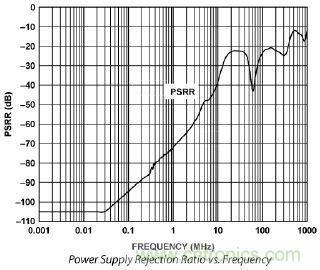 電源抑制(PSR)測量電源紋波如何與ADC輸入耦合,顯現(xiàn)在其數(shù)字輸出上。如果PSR有限,相對(duì)于輸入電平,電源線上的噪聲將僅會(huì)受到30至50 dB的抑制。