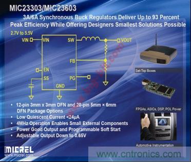 麥瑞半導(dǎo)體推出了采用HyperLight(R)Load技術(shù)的4MHz PWM 6A/3A同步降壓穩(wěn)壓器系列產(chǎn)品MIC23603/303。MIC23603/303采用的專利架構(gòu)提供了最高水準(zhǔn)的瞬態(tài)性能,在全脈寬調(diào)制(PWM)模式下輸出紋波僅有5mV。MIC23603/303將低損耗的專利功率MOSFET與麥瑞半導(dǎo)體擁有專利的恒定導(dǎo)通時間直流-直流開關(guān)轉(zhuǎn)換器方案結(jié)合在一起,可提供高達(dá)6A/3A的輸出電流,同時僅消耗24μA靜態(tài)電流。MIC23603/303是驅(qū)動機(jī)頂盒、便攜式設(shè)備以及汽車儀表中的FPGA、ASIC和DSP集成電路的理想產(chǎn)品,在這些應(yīng)用中,超快瞬態(tài)響應(yīng)和輕載效率至關(guān)重要。MIC23603目前已經(jīng)開始批量供應(yīng),千片訂量的價格為1.08美元/片。MIC23603的千片訂量價格為0.49美元/片。