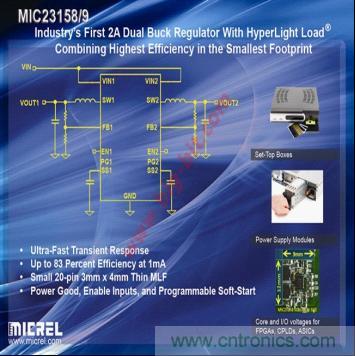 麥瑞半導(dǎo)體推出了兩款3MHz雙輸出2A高效降壓穩(wěn)壓器MIC23158/9。得益于麥瑞半導(dǎo)體擁有專利的HyperLight Load®技術(shù),這兩款集成電路為當(dāng)今最苛刻的應(yīng)用提供了超快的瞬態(tài)響應(yīng),包括機(jī)頂盒、針對FPGA的核心和I/O電壓、CPLD、ASIC、GPS/導(dǎo)航系統(tǒng)、PC卡、汽車儀表以及通用負(fù)載點(POL)直流-直流轉(zhuǎn)換等應(yīng)用。MIC23158/9目前已經(jīng)開始批量供應(yīng),千片訂量的價格分別為0.88美元/片和0.91美元/片。