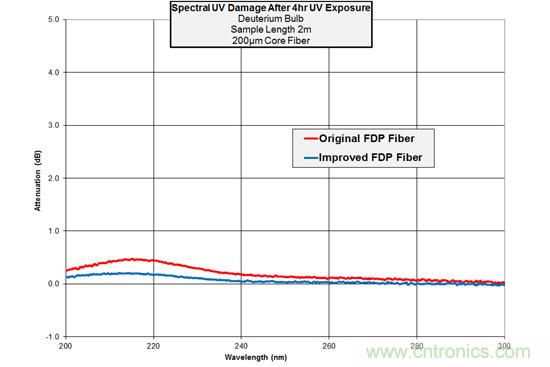 對于深紫外線領(lǐng)域應(yīng)用,高水平紫外線輻射的影響會引起光纖傳輸退化,光纖傳輸通常在數(shù)小時后發(fā)生損耗。