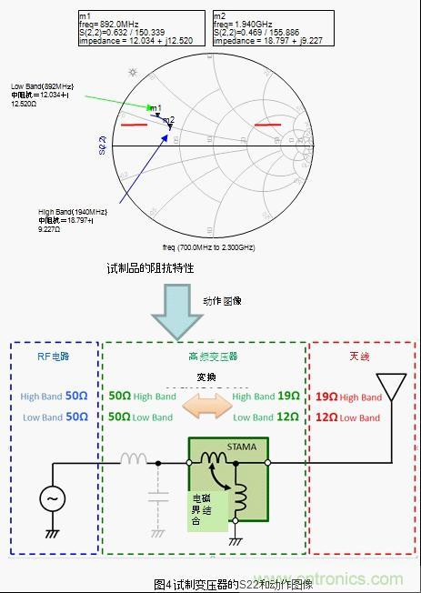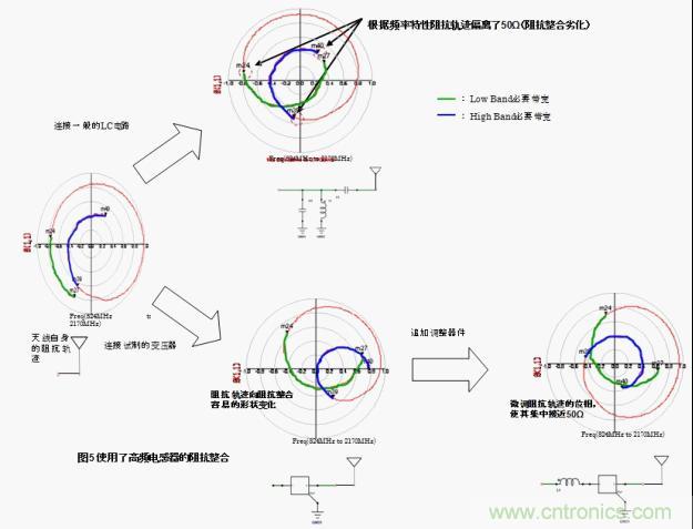將普通的LC電路跟天線連接,根據(jù)頻率特性的不同在廣帶寬情況下阻抗整合會變得困難。針對該情況,將本次試制的高頻變壓器跟天線連接,low band和high band都轉(zhuǎn)換成了最合適的阻抗。也就是說,工匠圖上的阻抗軌跡有可能變化成阻抗整合容易的形狀。之后通過外部的調(diào)節(jié)元件將阻抗軌跡的相位進(jìn)行微調(diào),有可能非常容易的就集中在50Ω附近了。(圖5)