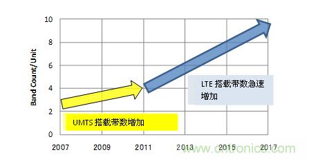 3G技術(shù)只是一種上行和下行達(dá)到數(shù)Mbps程度的速度,但是LTE卻以上行50Mbps以上,下行100Mbps以上的速度,達(dá)到了與固定通信網(wǎng)絡(luò)速度相同的目標(biāo)。GSM/UMTS對(duì)應(yīng)終端中,通常都是GSM搭載4個(gè),UMTS搭載2-4個(gè)頻帶,如果要對(duì)應(yīng)LTE的話還會(huì)再追加1-2個(gè)頻帶。圖1是移動(dòng)設(shè)備中搭載的平均頻帶數(shù)的推測(cè)圖。網(wǎng)絡(luò)上的通信量增大的同時(shí),保證了通信容量、通信頻率,LTE頻帶的搭載數(shù)量預(yù)測(cè)也將迅速增加。