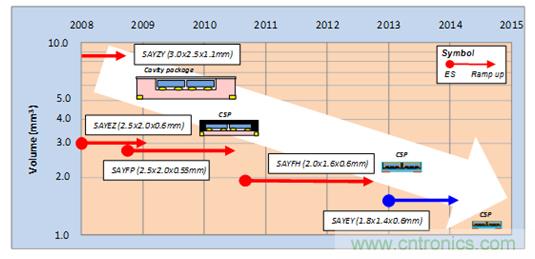 圖4所示是村田SAW雙工器產(chǎn)品尺寸的變遷。從舊的空腔3025尺寸(3.0×2.5mm),到后來通過確立樹脂封止方法將CSP型號(hào)成功產(chǎn)品化,實(shí)現(xiàn)了小型化。再后來,通過改善電極設(shè)計(jì)和加工技術(shù),繼續(xù)完善對(duì)小型化的完善。于是,2013年成功地將1814尺寸 (1.8×1.4mm)的CSP型號(hào)SAW雙工器產(chǎn)品化。它比現(xiàn)在主流的2016尺寸(2.0×1.6mm)還要再減少20%的搭載面積,成為了支撐今后搭載頻帶數(shù)量增加的新技術(shù)。