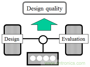西森久雄在總結(jié)時(shí)表示:“通過(guò)提供來(lái)自T3Ster測(cè)量結(jié)果的結(jié)構(gòu)函數(shù),與設(shè)計(jì)值的比較和驗(yàn)證可以更詳細(xì)的進(jìn)行。在可靠性測(cè)試中使用這個(gè)測(cè)量方法已經(jīng)幫助我們發(fā)現(xiàn)影響壽命的設(shè)計(jì)缺陷,而且由于設(shè)計(jì)值現(xiàn)在能夠測(cè)量出來(lái),因此進(jìn)行前端裝載成為可能。此外,我們還可以通過(guò)降低設(shè)計(jì)中的重復(fù)工作以降低原型成本。”(圖 3)西森久雄通過(guò)一個(gè)汽車(chē)隱喻很好地表達(dá)了他對(duì)設(shè)計(jì)和評(píng)估過(guò)程的觀點(diǎn):“評(píng)估和設(shè)計(jì)就像質(zhì)量保證的兩個(gè)‘輪子’,重要的‘發(fā)動(dòng)機(jī)’則為輪子提供驅(qū)動(dòng)力。通過(guò)適當(dāng)?shù)亟M合 CAD、CAE 和自動(dòng)化測(cè)量,輪子將把‘優(yōu)質(zhì)的設(shè)計(jì)’帶到路上。”(圖4)