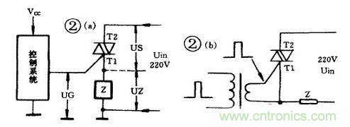改進此電路的方法之一是,采用觸發(fā)變壓器隔離控制系統(tǒng)的參考點(如圖2b), 觸發(fā)信號可以由BT33組成鋸齒波發(fā)生器受控于控制系統(tǒng)(矩形波也可以),這樣,不受初級參考點的影響,觸發(fā)變壓器次級可直接接在G與T1之間,與負(fù)載上電壓無關(guān)。