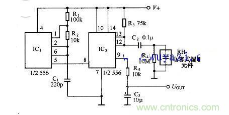 高分子電容型濕敏元件的應(yīng)用電路如圖所示。它由兩個時基電路IC1、IC2組成。IC1及外圍元件組成多諧振蕩器,主要產(chǎn)生觸發(fā)IC2的脈沖。ICz和電容型濕敏元件及外圍元件組成可調(diào)寬的脈沖發(fā)生器,其脈沖寬度將取決于濕敏元件的電容值的大小。調(diào)寬脈沖從IC2的9腳輸出,經(jīng)R5、C3濾波后成為直流信號輸出。它正比于空氣的相對濕度,其靈敏度為2mv/%RH。