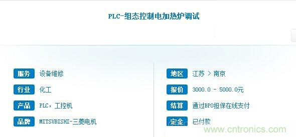 該項目由電加熱爐設備制造商發(fā)起,為該企業(yè)某型號的電加熱爐提供電氣控制開發(fā),具體由PLC作為控制主體,結合工藝需求完成編程和組態(tài)設計,后期完成儀表接線和調試工作,工作周期30天。該活兒經過3天發(fā)布后,接到17名工程師的投標方案,最終由周邊某市的一名gongkongBPO工程師承接完成。