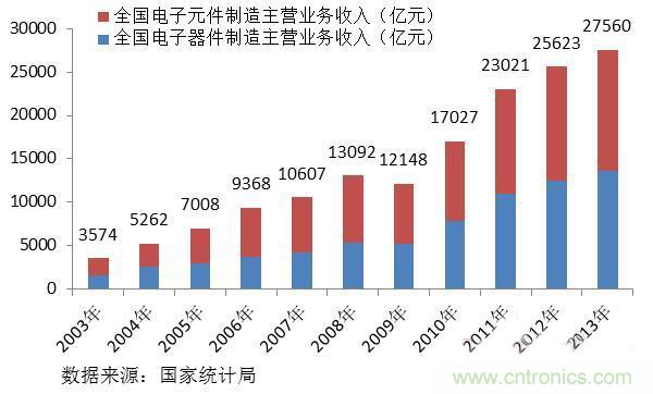 電子元器件是我國(guó)電子信息產(chǎn)業(yè)中的重要門(mén)類(lèi),產(chǎn)值比重約占電子信息產(chǎn)業(yè)的五分之一。2003-2013年,我國(guó)電子元器件行業(yè)增速迅猛,年復(fù)合增長(zhǎng)達(dá)到了22.7%,從2003年的3574億元增長(zhǎng)到2013年的2.76萬(wàn)億元。其中,2013年電子器件制造和電子元件制造主營(yíng)業(yè)務(wù)收入分別達(dá)到1.39萬(wàn)億和1.36萬(wàn)億元。