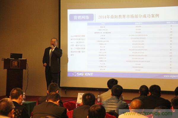 會議伊始,鼎陽科技董事長兼總裁秦軻先生進(jìn)行了精彩致辭,總結(jié)了鼎陽科技在2014年取得的巨大成就,展望了鼎陽科技在2015年的宏偉前景,為鼎陽科技在新一年的持續(xù)高速增長擺下了棋陣。2014年鼎陽科技的銷售額增長了41%;MSO2000、SDS3000、SDM3000在取得了眾多工藝上的突破之后順利量產(chǎn)。去年,鼎陽科技美國分公司在克里夫蘭正式成立,為北美市場的下一輪增長做了堅(jiān)實(shí)的鋪墊。2014年,鼎陽科技參加了海內(nèi)外的多個大型展會,標(biāo)志著鼎陽科技正式立足于測試測量儀器領(lǐng)域主流品牌的行列。與此同時,鼎陽科技與廣州工業(yè)大學(xué)深度合作,建立了聯(lián)合實(shí)驗(yàn)室,第一屆鼎陽杯也圓滿落幕,增強(qiáng)了鼎陽科技在高校用戶群體中的知名度,進(jìn)一步鞏固了鼎陽科技在教育領(lǐng)域的影響力。