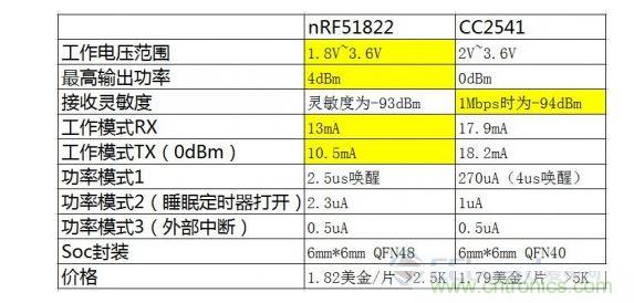 簡(jiǎn)單的對(duì)比中我們可以發(fā)現(xiàn),這顆Nordic N51822 Soc功耗絕不是蓋的,相比Ti的 CC2541將近低了30%~40%(有點(diǎn)不可思議)。