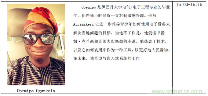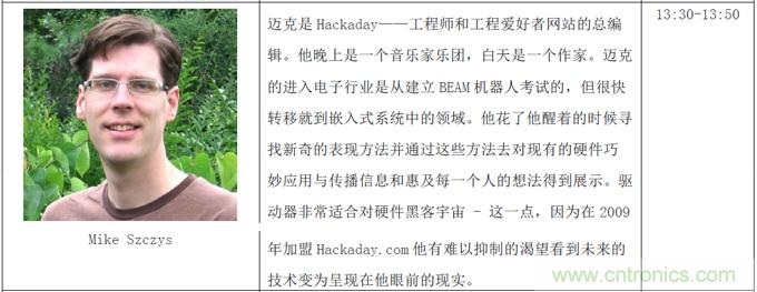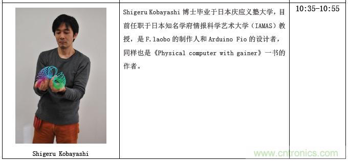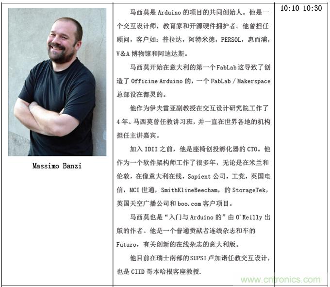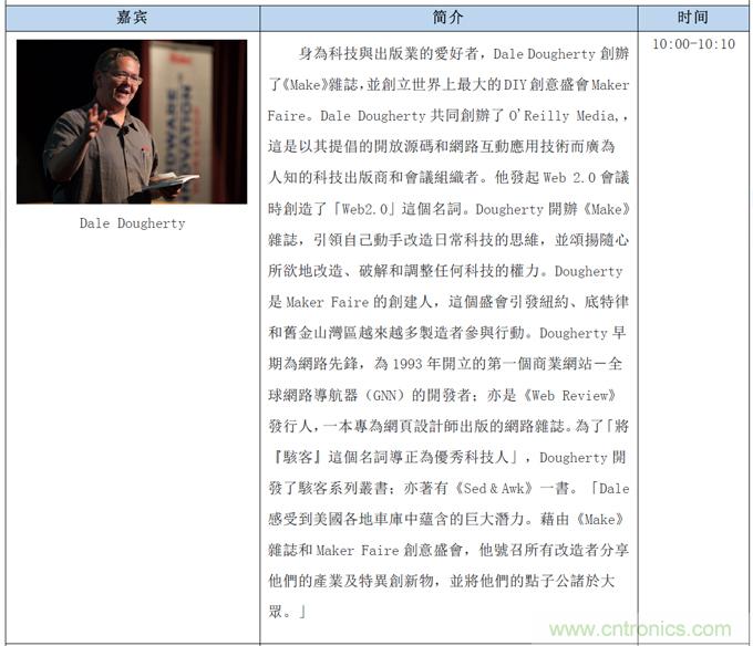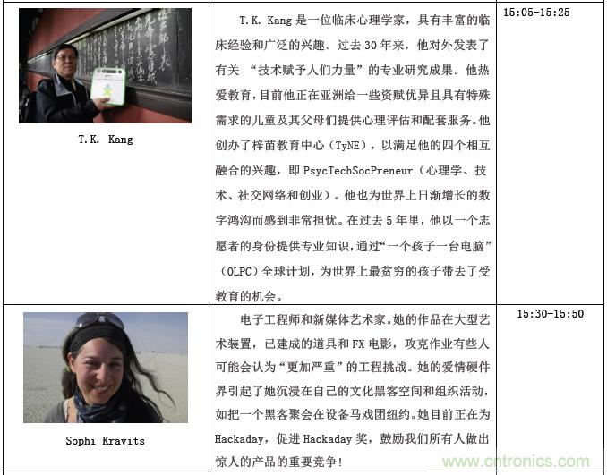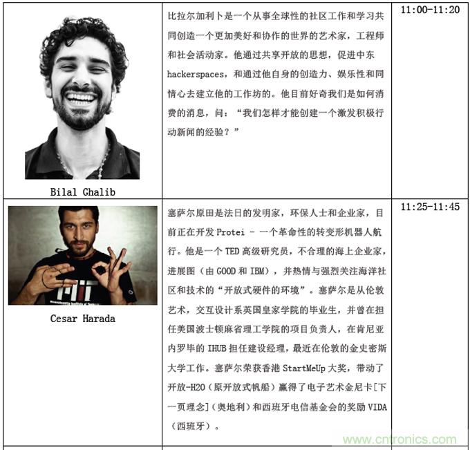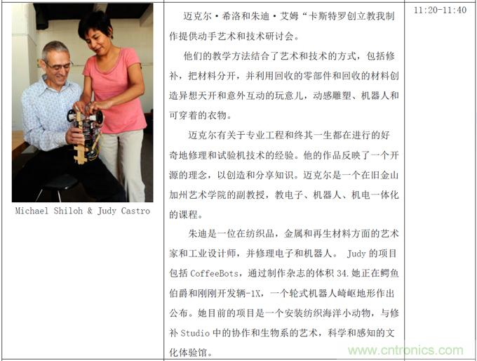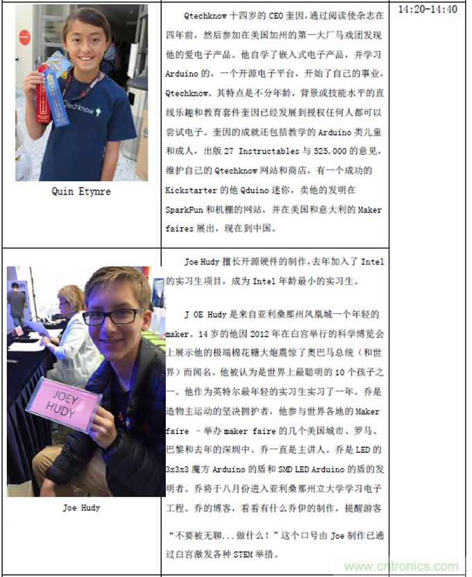 原型開(kāi)發(fā)平臺(tái)聯(lián)合創(chuàng)始人Massimo Banzi、第一個(gè)生物創(chuàng)客空間BioCurious聯(lián)合創(chuàng)始人Tito Jankonski、F.laobo的制作人和ArduinoFio的設(shè)計(jì)者Shigeru Kobayashi、Intel最小的實(shí)習(xí)生Joey Hudy和為麻省理工研究生授課的14歲電子神童QuinEtnyre等等共50余位來(lái)自全世界各地的創(chuàng)新領(lǐng)域領(lǐng)軍人物。