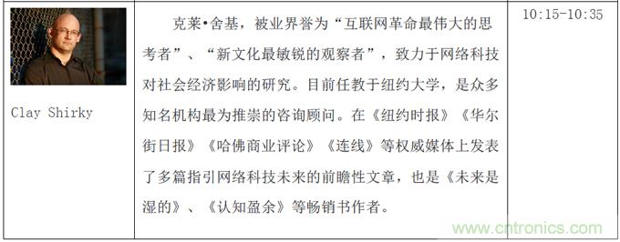 本次創(chuàng)客論壇三天共三個(gè)主題:?jiǎn)⒚蓜?chuàng)新、創(chuàng)客本質(zhì)和協(xié)同合作,將邀請(qǐng)到包括暢銷(xiāo)書(shū)《失控》作者Kevin Kelly、克萊舍基、Arduino開(kāi)源電子