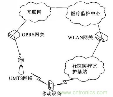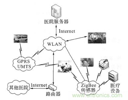 系統(tǒng)中包括無線個人網(wǎng)絡(wireless person2al area network,WPAN ) 、ZigBee網(wǎng)絡以及一系列醫(yī)療監(jiān)護網(wǎng)絡的醫(yī)療傳感器節(jié)點。本系統(tǒng)具有良好的擴展性,例如醫(yī)護人員在急救途中或在其他醫(yī)院可以分別利用WLAN /UMTS網(wǎng)關(guān)和互聯(lián)網(wǎng)與系統(tǒng)進行信息交互。