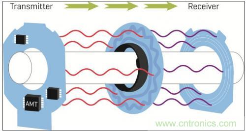 第三種方法,即電容式編碼方法,具有光學編碼器和磁編碼器的所有優(yōu)點,但是卻沒有它們的缺點。這種技術利用的原理與成熟、低成本而且精密的數(shù)字游標卡尺相同。它具有兩個柱狀或線狀型式,一個在固定元件上,另一個在運動元件上,兩者一起形成了一個配置為發(fā)送器/接收器對的可變電容器,請參考圖3.當編碼器轉動時,一體式ASIC對這些線的變化進行計數(shù),并利用內插法尋找軸的位置和轉動方向,建立標準的正交輸出,以及其它編碼器提供的換向輸出,用于控制無刷直流(BLDC)電機。