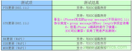 從測試結(jié)果可以看出,iPhone 4的GTK更新報(bào)文并不符合802.11i協(xié)議的規(guī)定,對group message2的key length域錯(cuò)誤的進(jìn)行了賦值。H3C設(shè)備由于對此采用了寬進(jìn)嚴(yán)出的原則,可以很好的進(jìn)行兼容。這一點(diǎn)也體現(xiàn)出手機(jī)終端兼容性測試的重要性。