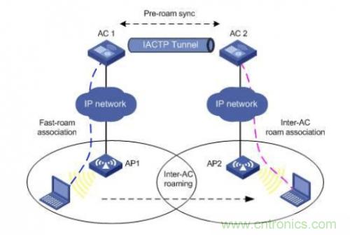 AC間漫游(Inter-AC roaming):一個(gè)無線終端從AC的AP漫游到另一個(gè)AC內(nèi)的AP中,即稱為AC間漫游。如圖2所示。