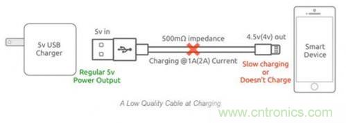 還拿上面那個例子來解釋,在2A充電電流下,會產(chǎn)生1V的電壓降,設(shè)備端充電電壓僅為4V。除了可能會帶來安全性問題之外,對智能設(shè)備而言,這么低的電壓甚至無法對設(shè)備充電。
