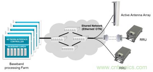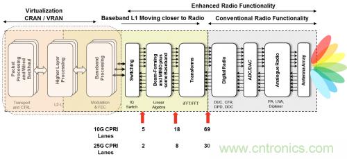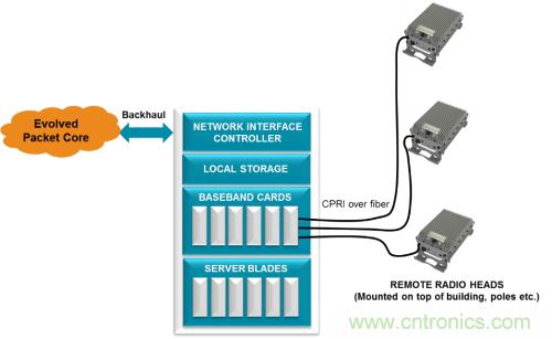 射頻單元位于緊鄰塔頂天線的位置,以避免功率損耗。這些遠端射頻單元通過光纖連接至基帶 BTS 機架。制定的通用公共無線接口(CPRI) 協(xié)議用來傳輸數(shù)據(jù)和同步遠端射頻。在有些無法使用光纖的情況下,使用微波或毫米波無線電來傳送 CPRI 有效負載。這種架構(gòu)轉(zhuǎn)變使運營商有望能夠混合使用和匹配來自不同系統(tǒng)廠商的無線電和基帶機架,以降低成本,改善供應(yīng)鏈,以及簡化庫存管理。然而互操作性問題讓這種希望化為了泡影,不過為一級系統(tǒng)廠商開啟了新方法,使其能夠利用來自小廠商的無線電設(shè)備來控制針對不同地區(qū)的無線電設(shè)備種類的快速增長。